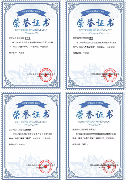 近日,2024年全国大学生金融素养知识竞赛全国赛传来喜讯,我校建筑管理工程系互联网金融专业学生张艺莹荣获决赛一等奖,陈钰、刘泽强荣获决赛二等奖,陈海菲荣获决赛三等奖,互联网金融专业实现参赛获奖率100%。2024年全国大学生金融素养知识竞赛全国赛由全国金融职业教育教学指导委员会主办,中南财经政法大学、对外经济贸易大学、山东大学、浙江金融职业学院等近200所院校报名参加,参赛师生10000余人。大赛致力于帮助大学生...