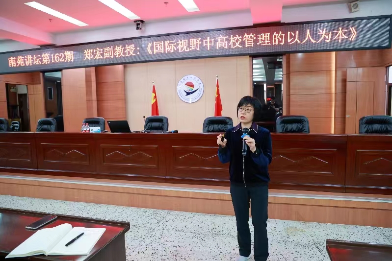 在《国际视野中高校管理的以人为本》报告中,郑宏老师从“什么是以人为本的管理”“高校管理如何以师为本”“高校管理如何以生为本”“结论与启示”四个方面讲解了高校管理以人为本的内涵外延,提出了“师生的存在才使一所学校成为真正意义上的学校”这一管理工作根本出发点。以理念输出和真实案例的方式讲解如何“以师为本”“以生为本”。最后,郑宏老师提出“高校以人为本管理的核心是主动服务”,要突出“精诚的服务态度、精准的服务对象、精细的服务过程”,在“理念+制度+执行”三方形成合力形成以人为本的高校管理文化,以人为本完成管理转型。
