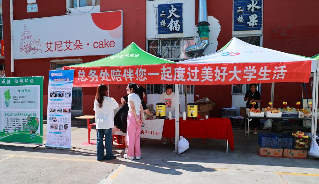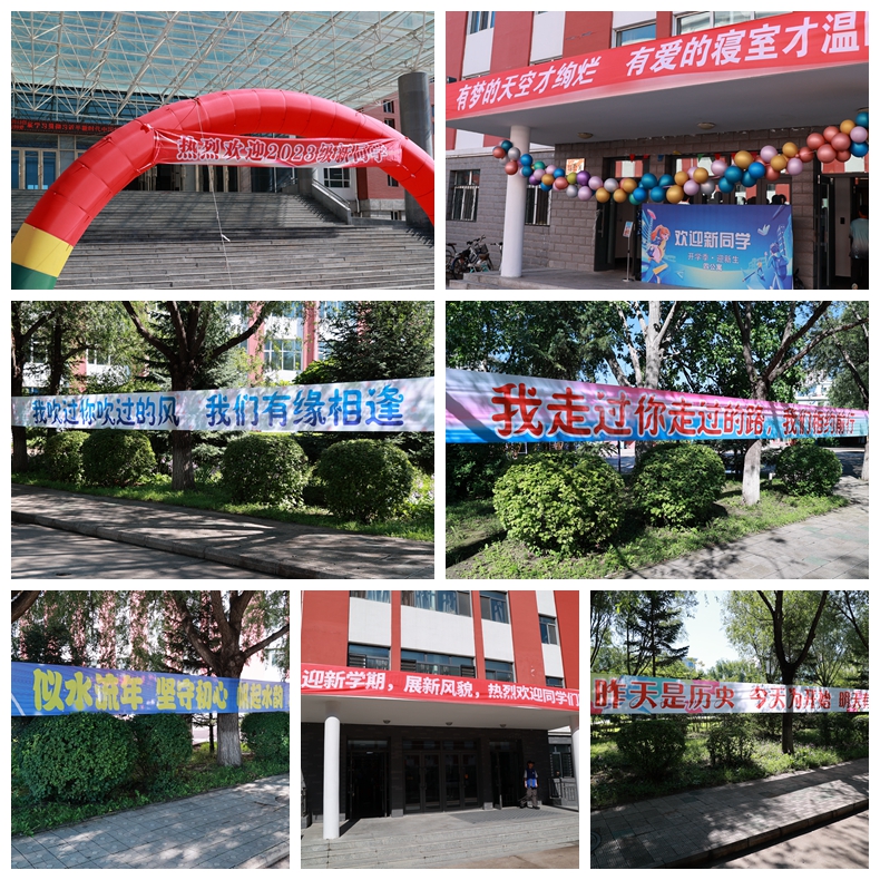 学校图书馆楼前设立拱形门,大屏幕上滚动播放着欢迎标语,各教学楼前悬挂迎新条幅,校园林荫路两旁设立迎新横幅,校园内回荡着欢快的歌曲。校门口设立新生服务处,为新生及家长提供咨询和引导服务。总务处设立“新生加油站”,为新生和家长提供暖心茶点和休息座椅,学校迎新仪式感满满,欢迎新生的到来。