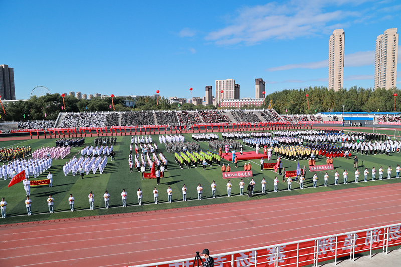 伴随着雄壮激昂的进行曲,国旗队、教官队伍、乐投app官方在线入口院旗、标语牌、红旗方队、花束方队、彩球方队、裁判员队伍、运动员队伍以及各系方队共39支队伍,迈着矫健的步伐从主席台前走过。