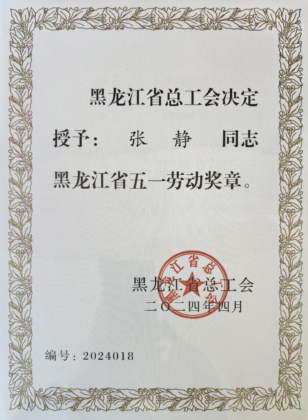 4月27日,由中共黑龙江省委宣传部、黑龙江省总工会主办的2024年黑龙江省五一劳动奖和工人先锋号颁奖暨“龙江最美职工”发布仪式在省会哈尔滨举行。副院长张静荣获黑龙江省五一劳动奖章。齐齐哈尔市共有九名各行业人员获此殊荣。