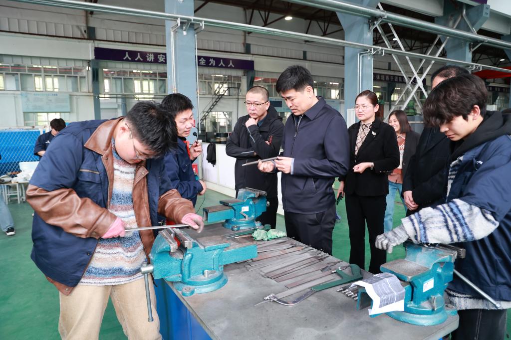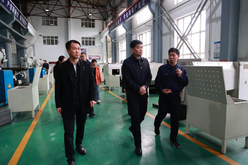 会前,郭海涛一行在学校领导的陪同下实地调研齐三机床和校园北区,听取了学校产教融合情况的汇报及所取得的成果。