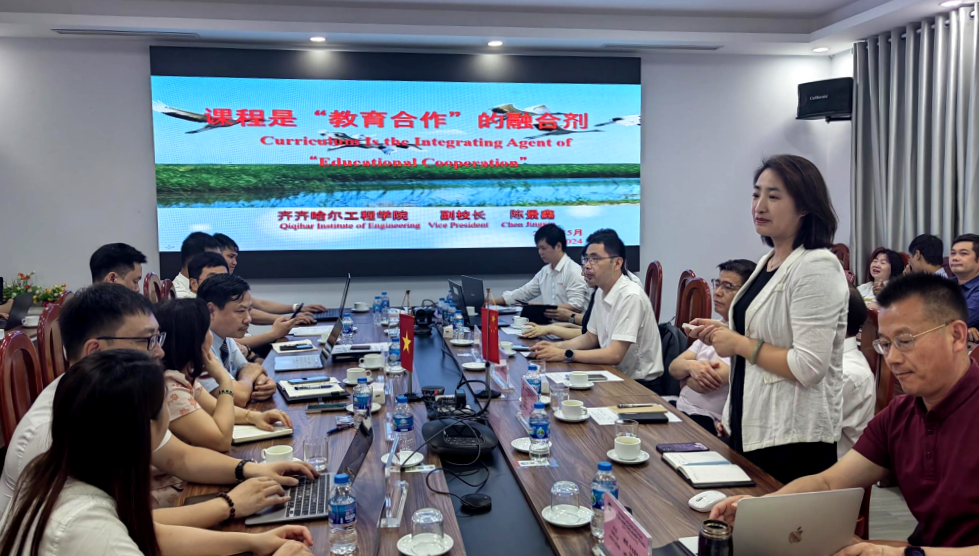 机电工程系副主任敖林喆以一门课程为例进行“FT(课程)”展示。考察团成员与参会各方就越南属地化人才培养、课程培训等事宜进行了深入交流。