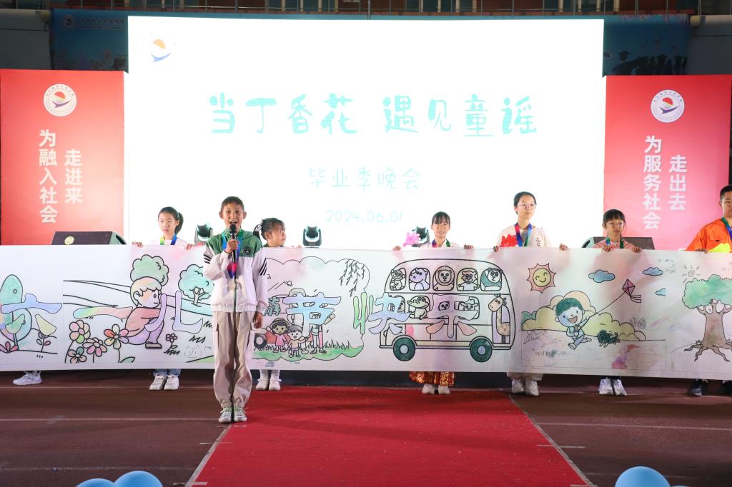 晚上,家长和孩子们与2200多名2024届毕业生参加了“当丁香花遇见童谣”毕业季晚会。教师乔亚男女儿于佳宁等10名教职工子女获得第二届“丁香少年”荣誉称号,10名小朋友向全体教师和毕业生等“大朋友”们送上了美好的祝福。