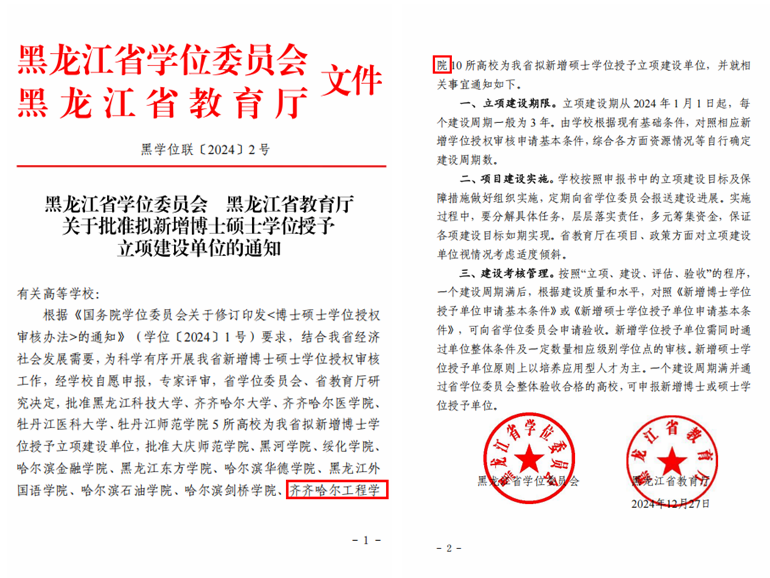 12月27日,黑龙江省学位委员会、黑龙江省教育厅下发了《关于批准拟新增博士硕士学位授予立项建设单位的通知》(黑学位联[2024]2号),我校成功获批硕士学位授予立项建设单位。