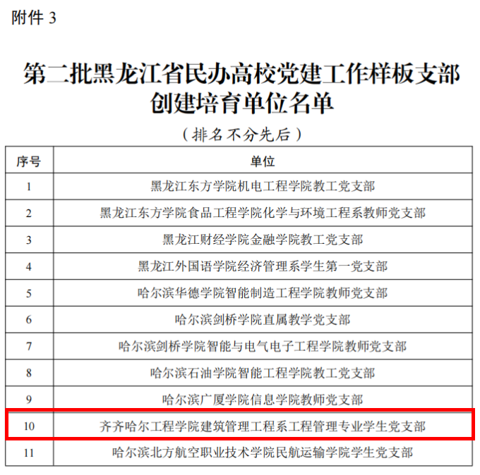 近日,黑龙江省委教育工委公布全省第二批民办高校党建“示范创建”评审结果,我校建筑管理工程系工程管理专业学生党支部获批党建工作“样板支部”培育创建单位。