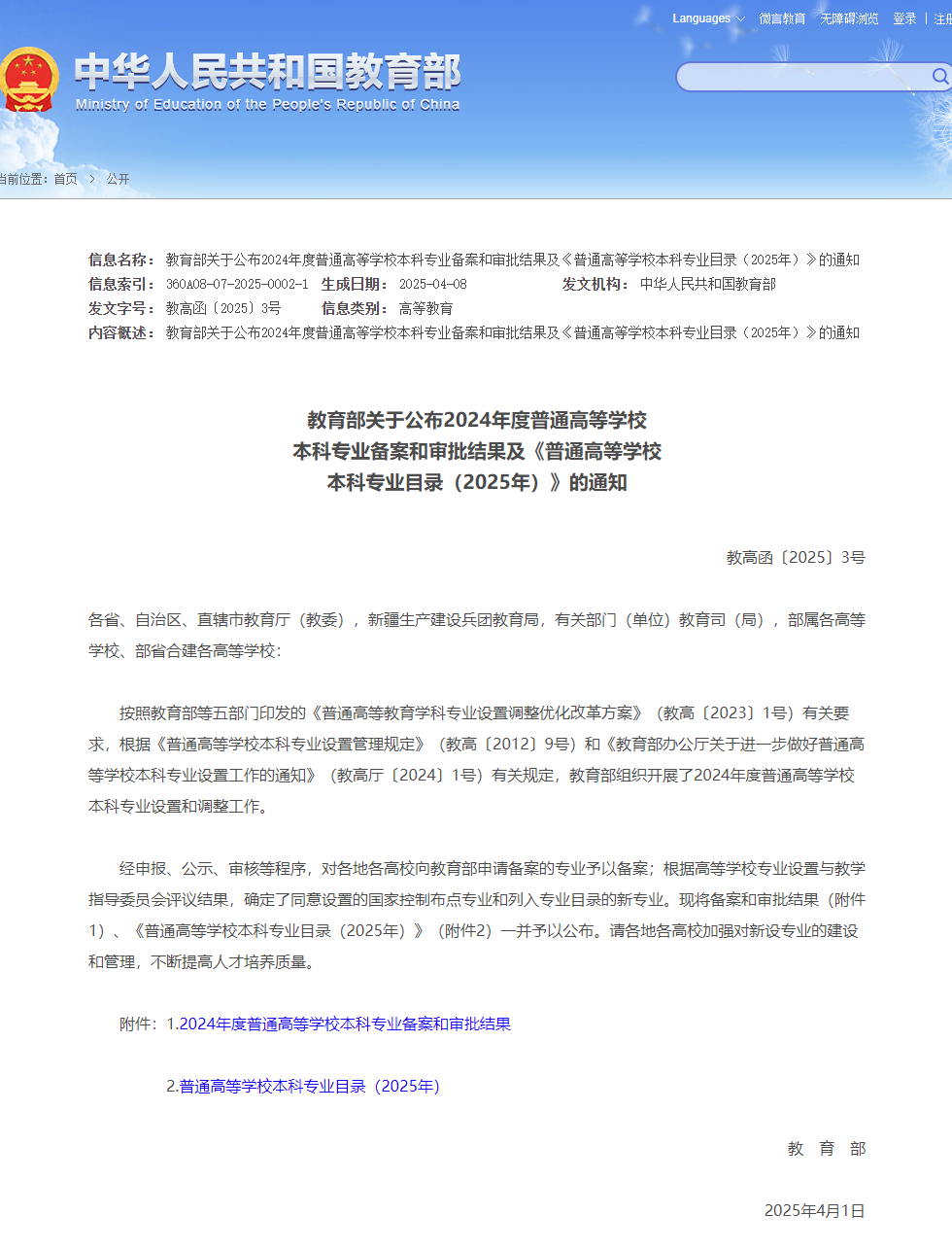 近日,教育部发布了《教育部关于公布2024年普通高等学校本科专业备案和审批结果及〈普通高等学校本科专业目录(2025)〉的通知》(高教函〔2025〕3号),我校申报的工程造价专业成功获批,并列入学校2025年招生计划。