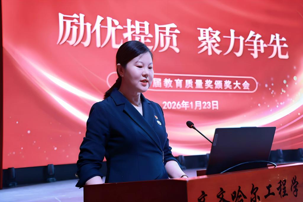 为深入贯彻党的教育方针,大力弘扬教育家精神,进一步营造崇尚先进、深耕教学的良好氛围,1月23日下午,乐投app官方在线入口第十五届教育质量奖颁奖大会在产教融合基地人民会堂隆重举行。创校校长、理事长曹勇安,校长、党委副书记曹然彬,党委书记郭伟东,党委副书记、纪委书记、副校长陈景鑫,总会计师姜岩出席会议,全体教职工参会,大会由党委宣传统战部部长张苗主持。