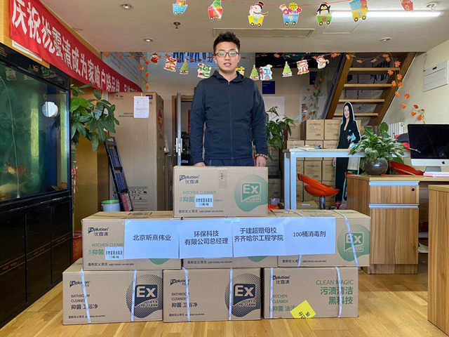 笔者通过电话联系到于建超,请他说一下事情的缘由。于总经理说,前些天他驾车外出办事,在路上收听交通广播听到一条关于武汉一所大学正在为下一步防疫工作筹备消毒液的新闻,一下让他想起了远在千里之外的母校,那里也一定需要这样的防疫物资,而自己眼下有办法有能力来做这件事。于是,就有了他和侯老师通话的一幕。随后,他又与学校校友会取得联系,并经过多方筹备把捐赠物资迅速邮发过来。