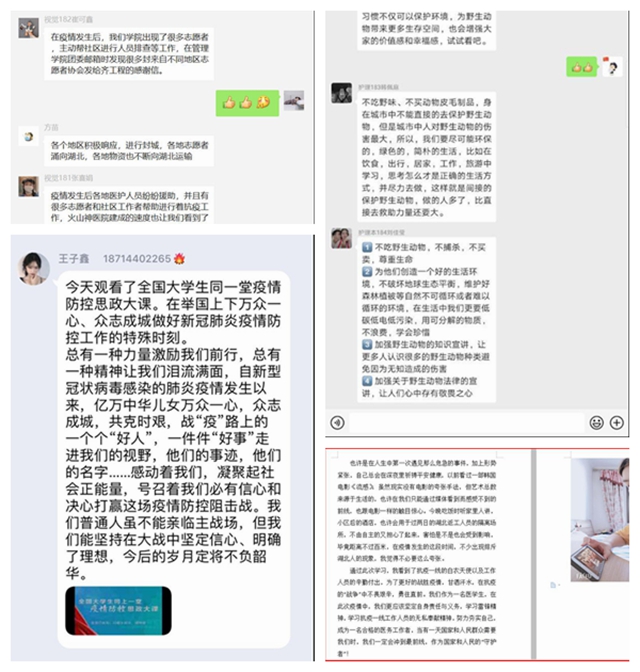 思政教学部教师在线与学生进行了讨论,一是围绕如何保护野生动物,敬畏大自然展开讨论,从中认识到大自然与人类是共同体,要积极保护自然,保护野生动物,参与公益宣传活动,发挥自己的作用,在生活中不浪费资源。二是讨论了“中国制度”优势集结强大战斗力,在这次疫情防控中得到彰显。为打好疫情防控阻击战,习近平总书记亲自指挥、亲自部署,作出一系列重要指示,各级党委政府按照党中央决策部署全面动员、全面部署、全面加强防疫工作,团结带领广大人民群众,把落实工作抓实抓细。全国人民齐心协力,共克时艰,这场没有硝烟的战争中,清晰地见证了我们党以人民为中心的执政理念,见证了党的强大政治领导力、思想引领力、群众组织力和社会号召力。三是关于“中国速度”的讨论,中国火神山和雷神山医院项目建设之快,迅速调集军队医护人员和各省医护人员驰援武汉,为解决患者入院问题开启新模式,为抗疫赢得了主动权。此次抗击新冠肺炎战“疫”中,一次次被刷新的“中国速度”让国人看到了战胜疫情的希望,坚定了战胜疫情的信心,充满了对美好生活的期待。