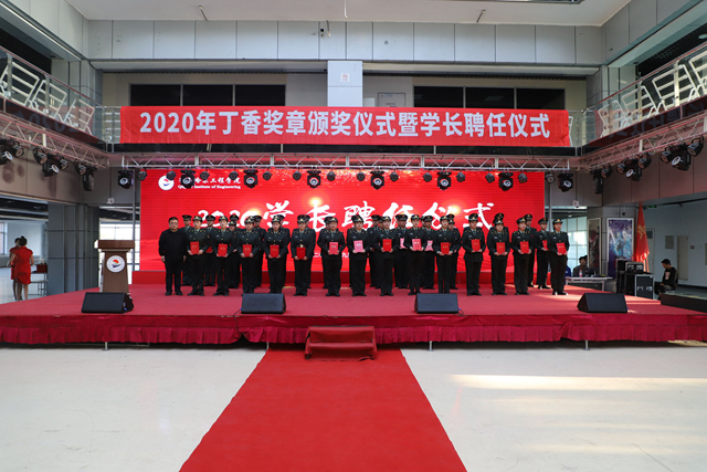 副院长张振笋、学生工作处负责人刘贤鹏为学长教官团授予团旗并颁发聘书。