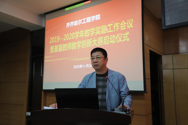 11月24日下午,学校采用线上+线下同步方式召开2019-2020学年教学奖励工作会议暨首届教师教学创新大赛启动仪式。校领导与全体干部、教学管理人员、教师代表在图书馆601报告厅参加会议,其他人员线上同步收看会议直播。