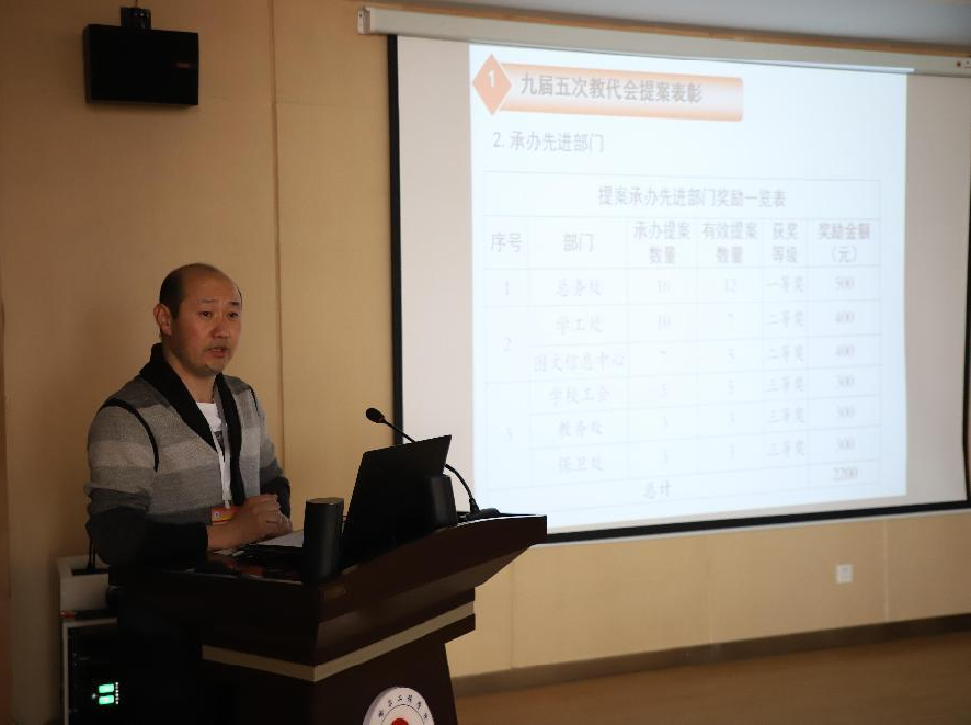 会上,工会委员陈茂松讲解了提案承办先进部门及优秀提案评选条件,公示了学校九届五次教代会提案承办先进部门和优秀提案奖励名单,并对提案承办先进部门、优秀提案人进行表彰奖励。