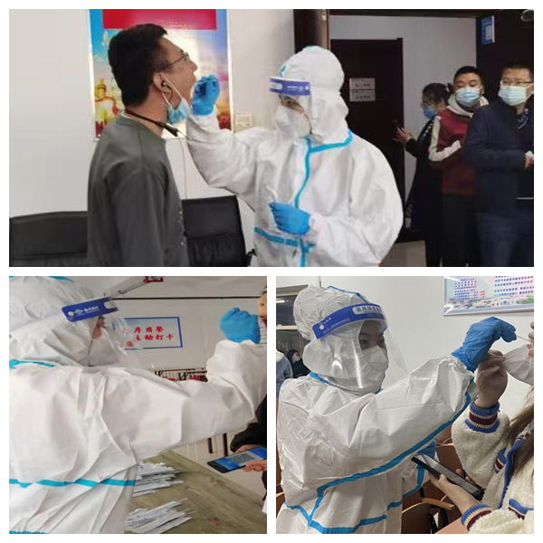 刘柏岑负责的是核酸采集工作。在凛冽的寒风中,她和齐齐哈尔市第一医院安图检验室的工作人员拿着核酸采集工具奔走在齐市的大街小巷,气温虽然很低,她身着密不透风的防护服却是满头大汗,防护面罩内也布满了一层层水雾,她没有一句抱怨。社区采核酸工作存在一定的感染风险,但共产党员的使命和信念不允许她有半步退缩,越是紧要关头,就越要迎难而上。“啊,请您张开嘴”“请戴好口罩,保持一米线的距离”她嘴上一次次的叮嘱,手上一遍遍重复着同样的动作,因为长时间站立导致她腿脚酸麻,但听到那一句“谢谢,你们辛苦了”,她便觉得所有的汗水与付出都是值得的。