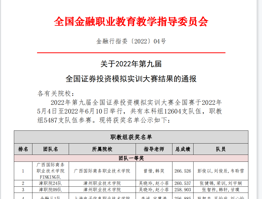 近日,在全国金融职业教育教学指导委员会主办、河南经贸职业学院承办、深圳市天择教育科技有限公司技术支持的“2022年第九届全国证券投资模拟实训大赛”中,我校互联网金融专业宋家豪、李思缘、李婉冬等33名同学获得全国赛团队一等奖1项、二等奖4项、三等奖6项,全体指导教师获得大赛“优秀指导教师”的荣誉称号。