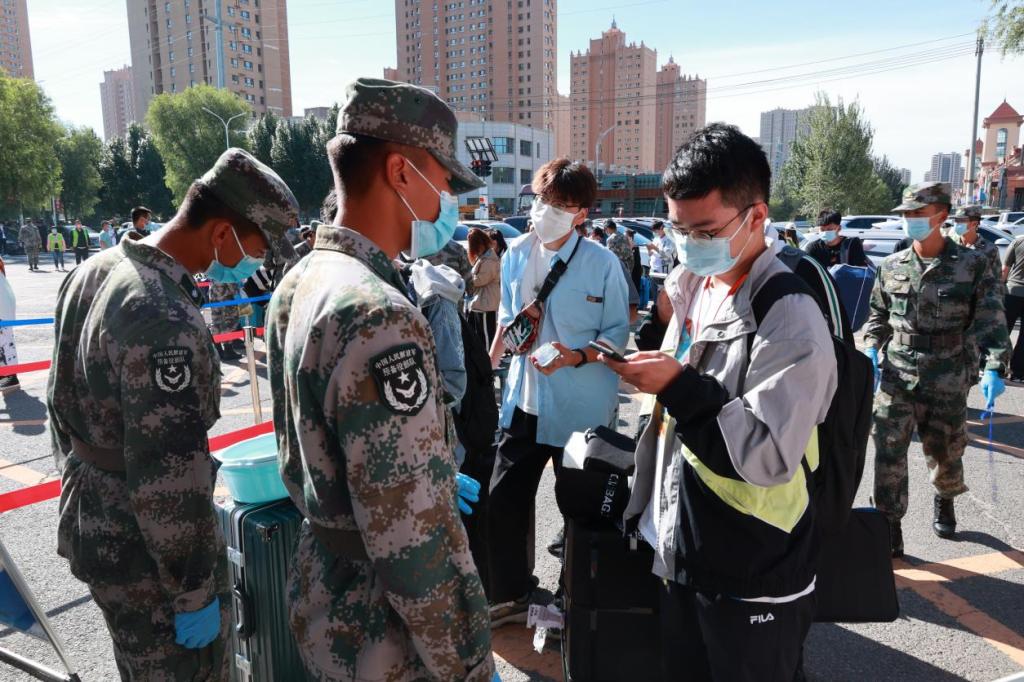 学校严格落实疫情防控要求,在校门口,学长教官团对新生及家长扫码测温,查验大数据行程码和龙江健康码绿码以及48小时核酸报告。