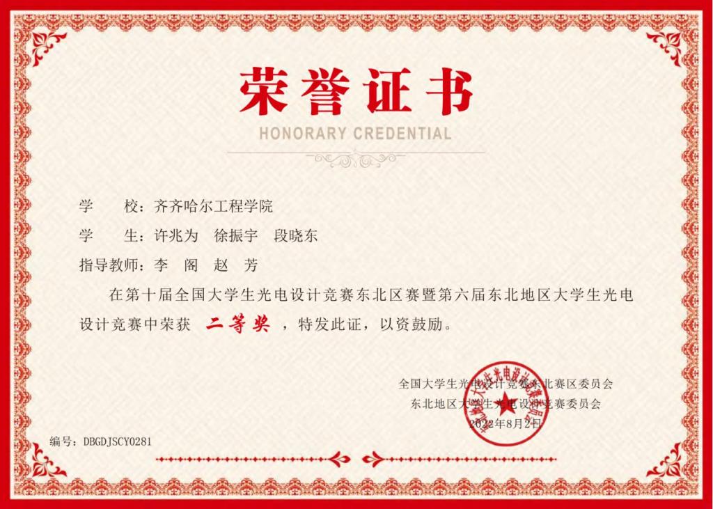 10月5日,信息工程系电子科学与技术专业收到了第十届全国大学生光电设计竞赛东北区赛暨第六届东北地区大学生光电设计竞赛组委会颁发的获奖证书。我校“风吟”队与“盎然”队获得佳绩。