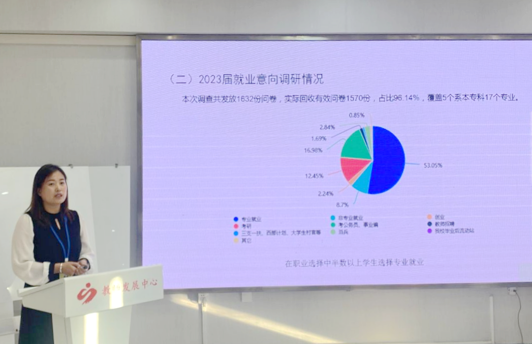 学生发展中心负责人康静对2023届毕业生生源及就业意向进行了分析,介绍了2023届毕业生职前教育系列活动方案及就业工作考核方案,明确工作目标、工作计划及具体要求。