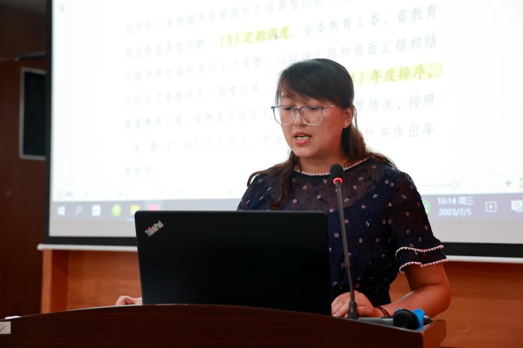 全面质量管理办公室主任孟艳辉对我校2023年度高质量发展自评自建工作方案、2023年乐投app官方在线入口高质量发展增值性评价任务分解表、2023年本科高校高质量发展增值性评价指标观测点进行了部署和说明。