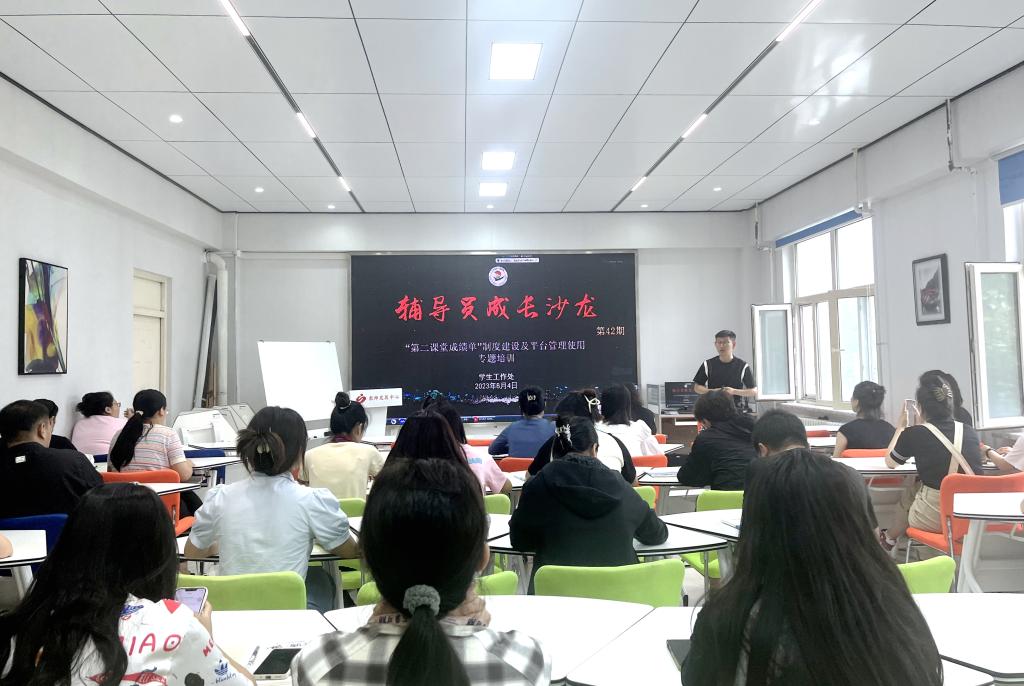 8月4日上午,学校第42期辅导员成长沙龙在二号教学区2102会议室举行。校团委王睿老师为大家讲解“第二课堂成绩单”制度建设并对平台管理使用进行专题培训。培训以线上线下的方式进行,43人参加。