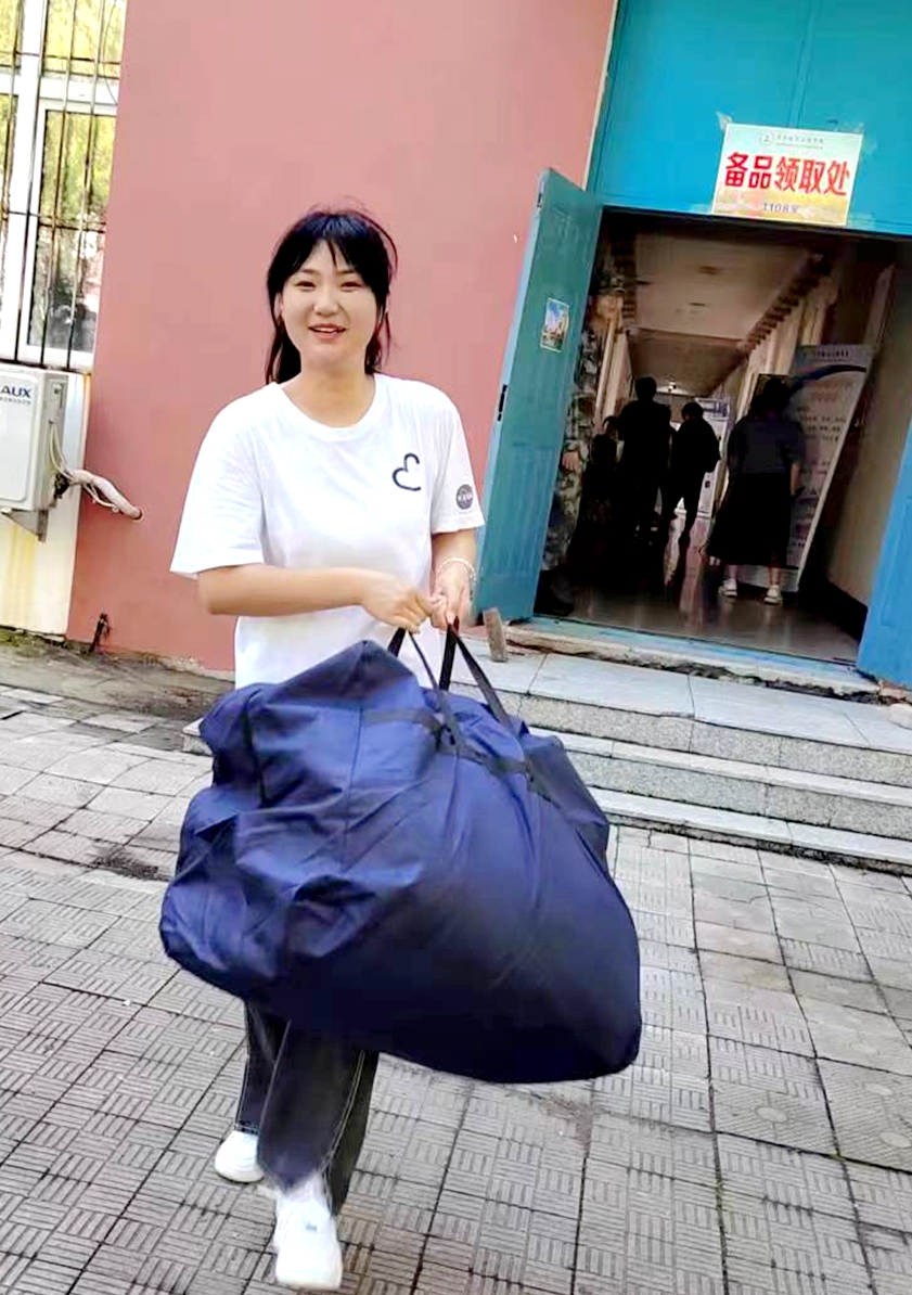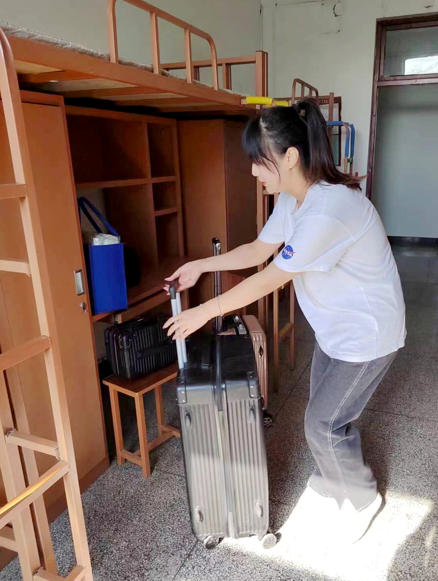 穿蓝马甲的健康与护理系学姐迎上去接过一个拉杆箱。