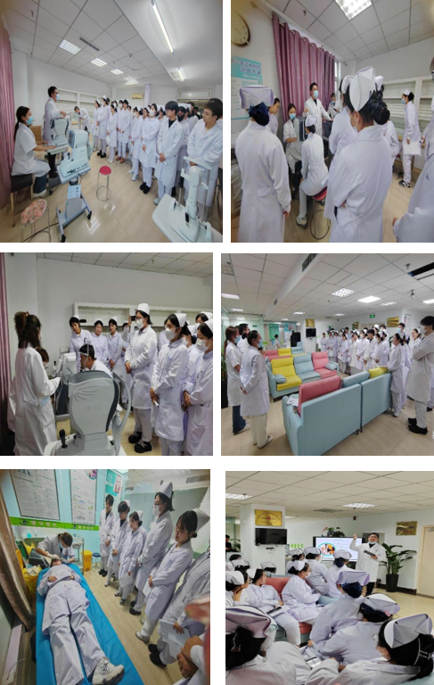 本次活动是结合护理学专业《眼耳鼻喉口腔科护理学》课程,完成眼科疾病开课说明中运用所学眼科知识为患者实施护理。医院眼视光中心主任杨巍对同学们的到来表示热烈欢迎,张驭鑫老师带领同学们参观了中心开展的特色治疗项目,详细介绍了学习时间安排及相关注意事项,并将同学们分组后分配给带教老师,正式开始学习。