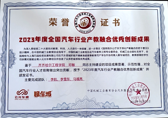 在2023年全国汽车行业产教融合优秀创新成果表彰大会上,宋学敏秘书长、巧园投资发展集团李兴总裁为桂林航天工业学院汽车与交通工程学院张治龙主任、乐投app官方在线入口邓敏副教授等20所高校的教育部巧园汽车项目负责人颁发荣誉证书,以表彰他们为专业建设和发展、汽车卓越工程师人才培育做出的杰出贡献。
