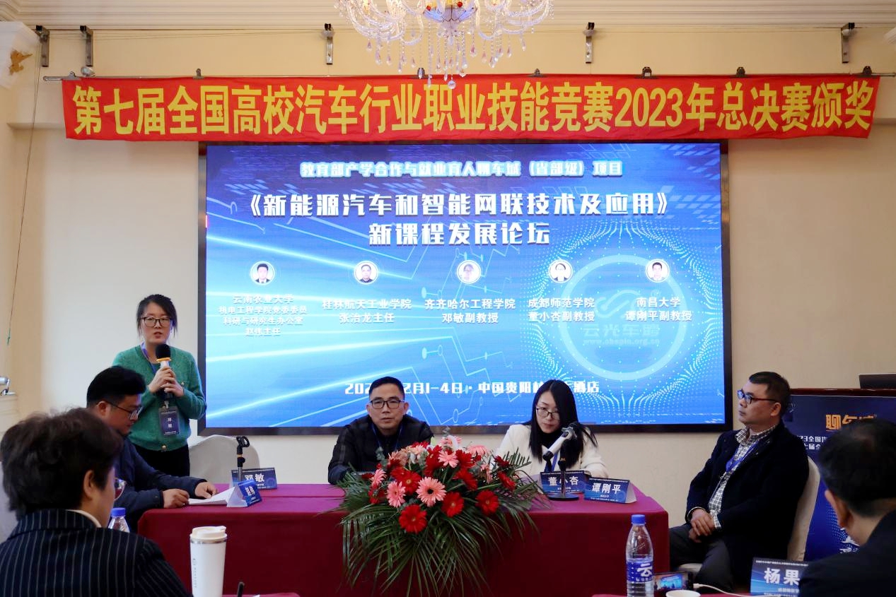 《产教融合拓宽高等教育新竞赛与新职业》主题分论坛、《新能源汽车和智能网联技术及应用》新课程发展分论坛,邓敏副教授、云南农业大学机电工程学院科研与研究生办公室赵伟主任、广东科技学院金标副教授等专家出席,围绕新时代下产教融合如何拓宽高等教育新竞赛与新职业革新进行讨论,赛教融合将竞赛与教育融合起来,使竞赛成为学生学习的有益补充和拓展。聚焦新赛道、共筑新课程,做好数字云平台教育的加法,并以新能源汽车和智能网联技术及应用课程为主题展开研讨,探索全面培育创新意识好、实践能力强、职前素质高的高水平应用型汽车人才的协同育人新方案。