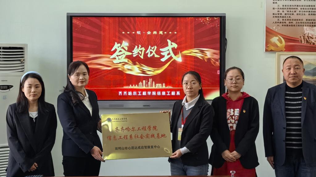 4月9日上午,信息工程系计算机科学与技术专业和双鸭山市心愿达成启智康复中心,在一号教学区2404会议室举办共建社会实践基地签约仪式。仪式由信息工程系负责人刘春媛主持,系党总支书记李野、党总支副书记孙晓芳、健康与护理系主任郭玲玲、计算机科学与技术专业负责人韩楠楠、双鸭山市心愿达成启智康复中心院长胡艳丽、教师陈卓参加签约仪式。