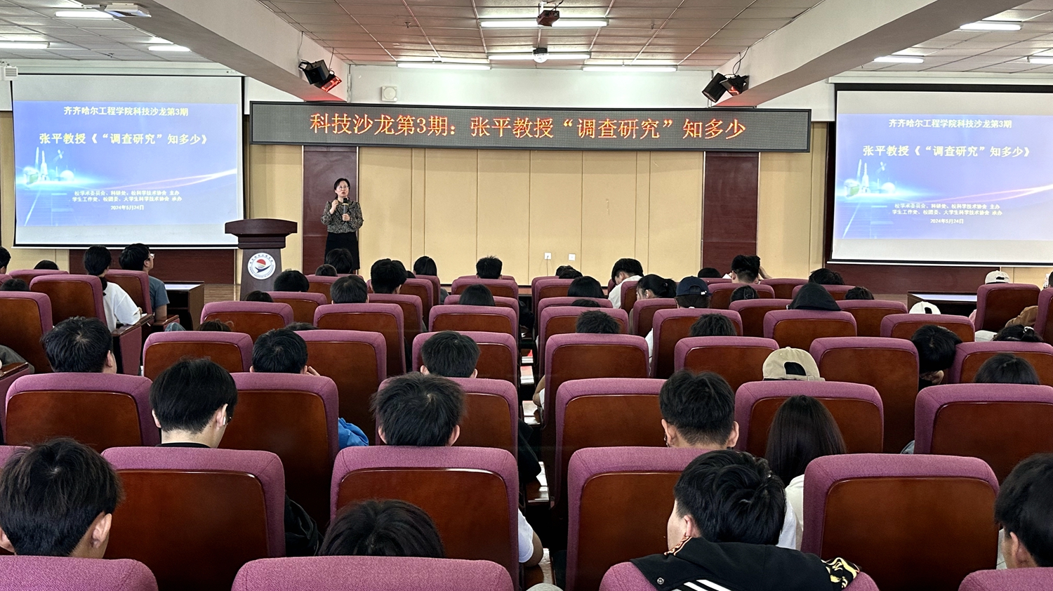 5月24日下午,由学校学术委员会、科研处、科学技术协会主办,学生工作处、校团委、大学生科学技术协会承办的第3期科技沙龙在图书馆501报告厅举行。本期科技沙龙邀请科研处副处长张平教授作题为《调查研究知多少》的专题报告,来自各系的近200名学生参加。