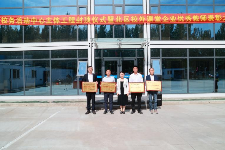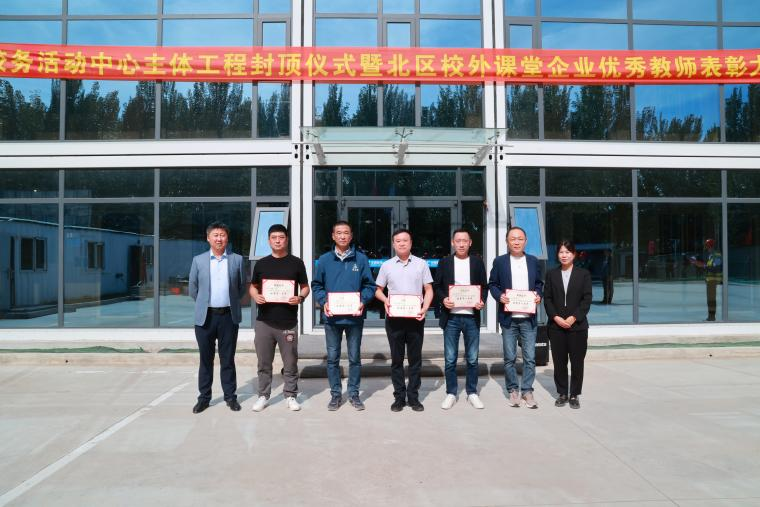 金秋送爽、枫红菊黄,9月17日上午,学校校务活动中心主体工程封顶仪式暨北区校外课堂企业优秀教师表彰大会在学校北区建设工地举行。建筑管理工程系党总支书记、系主任徐明,基建办主任崔晓东,教务处副处长郝丽娜,机电工程系党总支副书记于海龙,中国能源建设集团东北电力第二工程有限公司项目执行经理张德志、项目经理董立家,中建二局第四建筑工程有限公司乐投app官方在线入口项目指挥长战乃超、项目书记郑永会,齐恩消防公司副总经理王玉,黑龙江龙至信工程项目管理有限公司总经理赵双,齐齐哈尔市建设工程质量检测中心总经理刘喜星以及部分企业和学生代表参加。