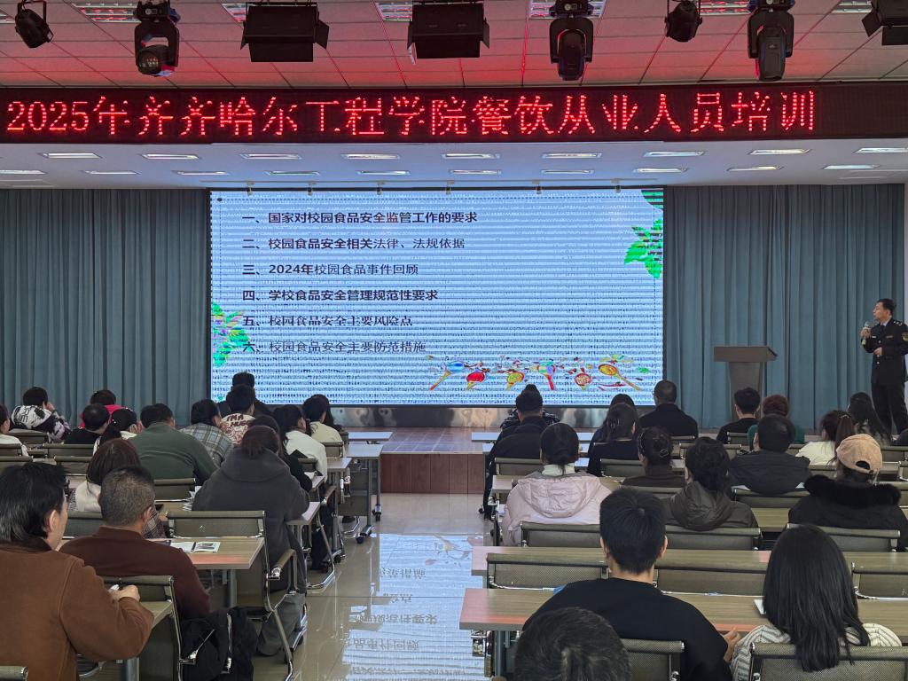 为进一步构建三全育人格局,守护全校师生“舌尖上的安全”,2月28日,总务处组织开展了2025年餐饮从业人员春季培训会。创校校长、理事长曹勇安、齐齐哈尔市市场监督管理局食品科科长刘文武出席培训会并作讲座,总务处、餐饮业主、从业人员142人参加培训。