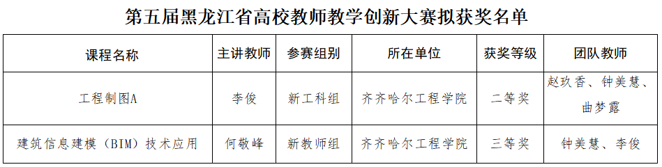 日,由黑龙江省教育厅主办的第届全国高校教师教学创新大赛(黑龙江赛区)在东北林业大学落下帷幕。学校建筑管理工程系教师李俊工程制图A》课程团队获得新工科副高组等奖、何敬峰建筑信息建模(BIM)技术应用》课程团队获得新教师等奖。