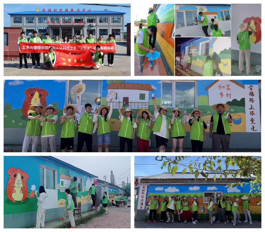 此前,7月22日至25日,土木与管理学院“绘梦乡土,共筑振兴”“三下乡”实践团队赴克东县蒲峪路镇幸福村开展实践活动。在风景园林专业指导教师袁继杰的带领下,团队圆满完成了蒲峪金豚养殖基地约180平方米的外墙彩绘任务,包括主题图案的设计施工及幸福村LOGO创作。其中,由艺术与体育学院姜岩老师设计的“幸福LOGO”凭借出色的创意,获得了当地党委宣传部的高度认可。
