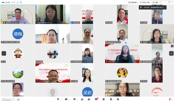 近日,学校通识教育学院党支部与齐齐哈尔医学院联合第三党支部共同举办了以“结对共建聚合力,党务业务深融合”为主题的党建结对共建活动。本次活动在线上进行,两支部以虚拟教研室为平台,围绕微专业建设为主题的教学改革和外语“三进”工作展开交流,深入推进跨校党建联动与教学资源共享。此次活动由通识教育学院党支部书记张洪岩主持,齐齐哈尔医学院联合第三党支部书记程前光及所属支部党员全程参与,通识教育学院党支部全体党员及大学外语教研室全体教师参加。