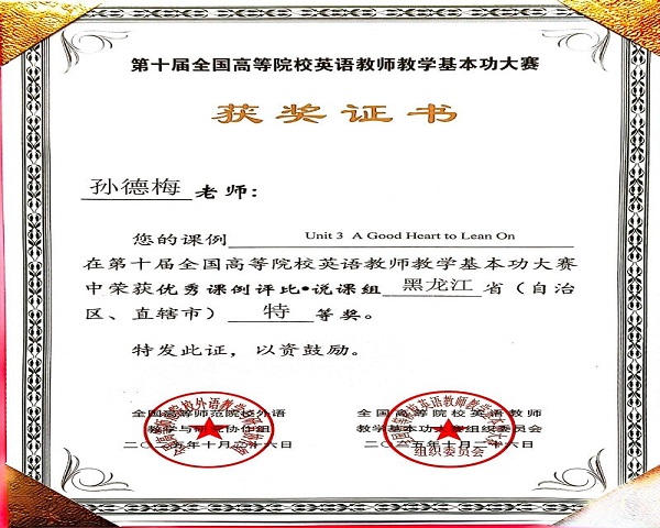 近日,第十届全国高等院校英语教师教学基本功大赛省赛结果正式公布,我校通识教育学院大学外语教研室参赛教师在省赛阶段喜获佳绩。参赛的10名教师全部获奖,获奖率达100%,较上一届有大幅提升。其中,孙德梅老师荣获优秀课例评比•说课组黑龙江省特等奖;孙伟、刘欢老师荣获实录课组黑龙江省一等奖;刘双丽老师荣获实录课组黑龙江省二等奖;乔亚男老师荣获说课组黑龙江省二等奖;齐锐、徐怡、鹿惠敏老师荣获说课组黑龙江省三等奖;李爽、史紫嫣老师荣获实录课组黑龙江省三等奖。