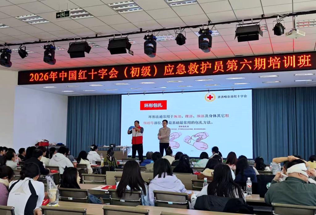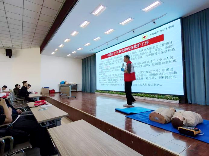 为深入贯彻《“健康中国2030”规划纲要》及教育部关于开展全国学校急救教育试点工作的通知精神,将“人道、博爱、奉献”的红十字精神与大学生思政教育、劳动教育相结合,构建平安校园防线,4月11日,学校医学院联合齐齐哈尔市红十字会龙沙区分会,组织开展了应急救护专题培训。医学院院长孙强、教学副院长郭玲玲,艺术与体育学院副院长高爱利,医学院教职员工,保卫处教工及学生代表共计90人参加培训。