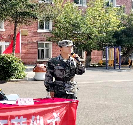 参训班主任逯恒良代表教师发言。他表示,军训期间,我们将和同学们一起迎接风雨,并肩作战!全体教师一定尽心尽力、尽职尽责,坚持教书育人、管理育人,为同学们搭建展示能力的平台,为同学们服务,让同学们满意,让家长放心。