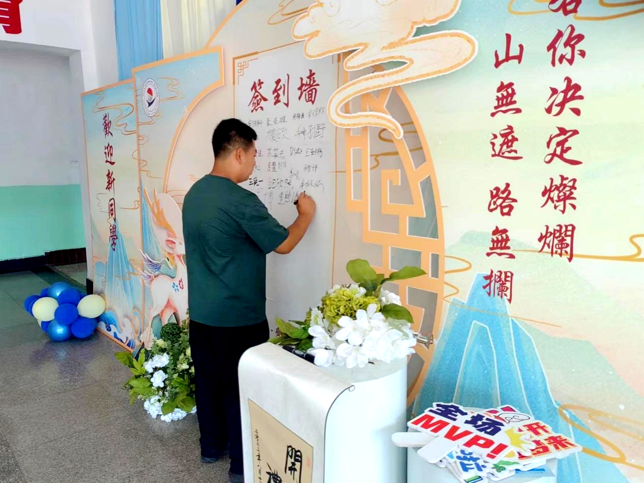 校门口大屏幕播放学校宣传片供家长和学生观看,校内播放着朝气蓬勃的歌曲,主楼内设有签到墙,校园内到处洋溢着欢乐的气氛。