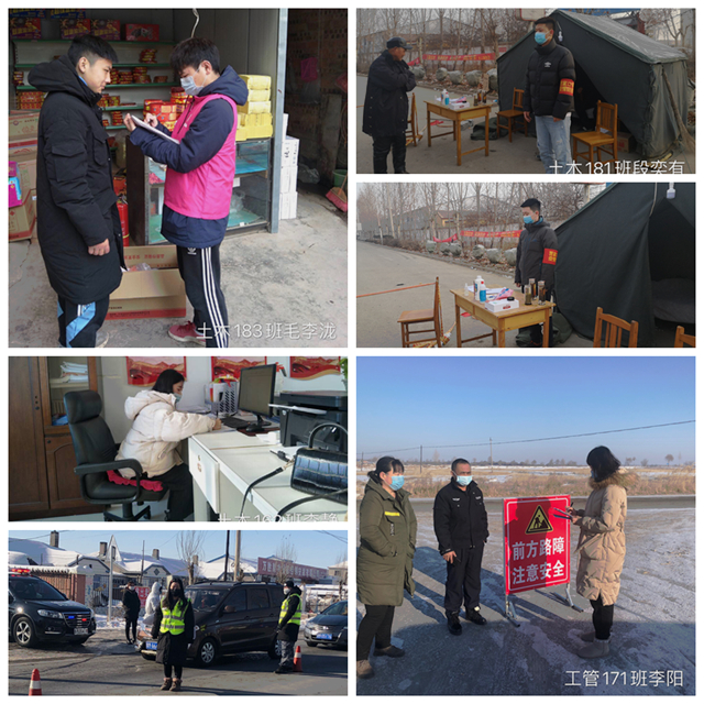 风景181班赵梓涵同学、土木183班毛李泷同学积极参与到社区访和疫情应急巡防之中;工管171班李阳同学、土木162班李静同学按照村里安排参加路口值守,对外来人员进行信息登记,在体温测量点为外来人员测量体温;土木181班段奕有同学182班段奕成同学,加入贾家口村防疫情支援队,外来人员进行信息登记测量体温