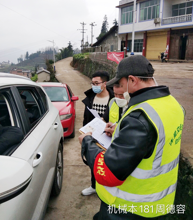 机械本181周德容同学跟随村的党支部书记、主任及党员同志开展防疫宣传,在村主要路口检查进出车辆并进行人员信息登记,同时提醒做好相关防护。