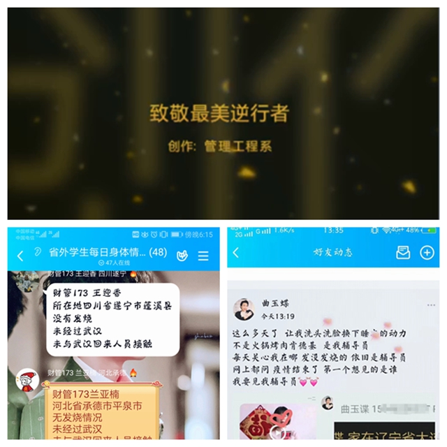 管理工程系辅导员刘娜,贯彻学校每日疫情零报告制度,通过QQ群对其所带班级学生特别对南方学生加以关注她每天组织学生上报家庭住址、当天所在位置及身体是否有异常等信息还通过抖音直播的方式召开题为《抗击疫情 我们在行动》的主题班会,从正确认识和了解疫情、防控疫情的方法、如何合理度过剩余假期及开学前应该做好哪些准备等几个方面与所带的4个班级学生进行网络“面对面”交流。同时,她还组织系部分学生代表录制短视频,向奋战在抗疫前线的最美逆行者致敬。