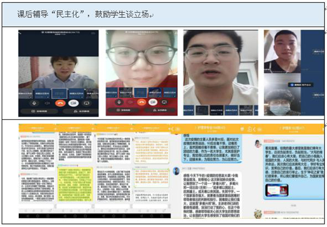 在战“疫”特殊时期,赵婷婷老师特别重视做好在线教学的课后辅导工作,经常以线上班会座谈的方式对专业班级学生进行辅导。因为她在学习赵炬明教授《关于实施“以学生为中心”的本科教学改革的思考》时,了解到“大学是培养抽象思维和理性思维的窗口期”,因此她还积极组织学生讨论时事的“线上圆桌派”活动,以此开阔学生视野,拓展学生思维,培养学生的理性思维能力和批判能力,努力实现教学由“老三中心”向“新三中心”转变。