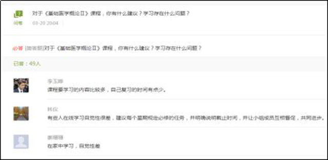 二是选取学生提交的一些有代表性的笔记、作业、讨论等进行分享,共同点评,例如:选一些典型问题的作业,大家一起找错误,对优秀的作业给予表扬: