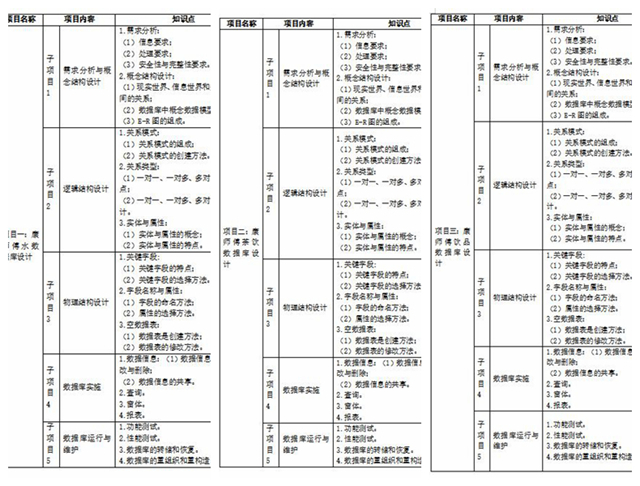 三个真实项目支撑了被重构的课程体系,数据库设计项目的五个典型的工作步骤(需求分析与概念结构设计--逻辑结构设计--物理结构设计--数据库实施--数据库运行与维护)在任一项目中不断反复出现,难度逐渐递增,最后完成三个完整的数据库项目:康师傅水数据库设计、康师傅茶饮数据库设计、康师傅饮品数据库设计。图1展示了每个项目中知识点和技能点的个数。