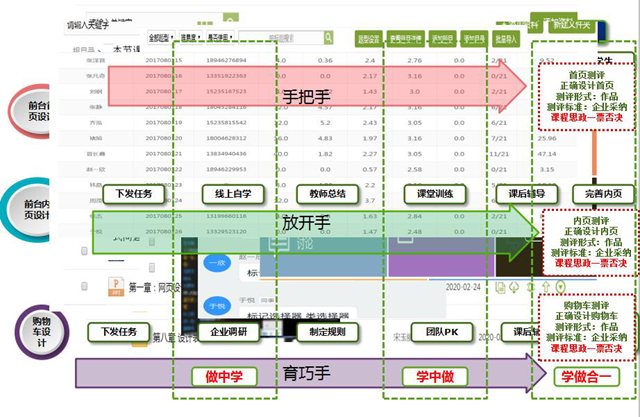 (一)“三手、三做”,无缝对接工作任务。东北有机黑木耳网站建设项目中网站前台设计分为3个子模块:前台乐投(中国)设计、前台内页设计以及购物车设计,3个模块由简单到复杂依次递进。在第一个模块乐投(中国)设计中,教师手把手地教,课前下发学习资料、学习流程、预习测试和项目作业等,学生课前指导学弟完成素材、收集素材,学长指导学弟完成工作任务这个步骤贯穿每个模块,因为建设网站的素材来源于学弟,所以学长首先要指导学弟完成素材,从而实现了工作任务无缝对接,同时学长能够温故知新,达到双重学习效果。同时学生在课前自学课程包,初步完成乐投(中国)设计作品,同伴互教解决学习中遇到问题。在课中,教师直播讲解典型问题,学生领学并生生互评挑毛病。课后,教师在线反馈学生学习数据,检查学习产出,学生则完善乐投(中国)设计作品并提交,作品以企业是否采纳为主要标准,从而实现了课前、课中、课后有效衔接,工作任务无缝对接。在第二个模块内页设计中,教师放开手让学生自我学习,下发学习任务和项目作业,以任务驱动学生线上自学。学生遇到问题同伴互教,同时辅导学弟完成学习内容和项目作业,教师实时监控并及时指导学生学习中遇到的问题。在第三个模块购物车设计中,学生则以小组为单位独立完成工作任务,达到育巧手的效果。在整个项目实施过程中,课前学生自学完成课程包学习任务和作品初稿实现做中学,课中学生以小组为单位进行领学,生生互评挑毛病,教师和企业人员点评作品中存在的问题实现学中做,课后学生完善作品并提交实现学做合一,从而达到课前、课中、课后无缝对接,工作任务有效衔接的教学效果。