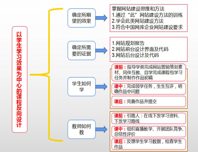 (二)以学生学习效果为中心,反向设计课程内容。首先确定所期望的效果,即学生掌握网站建设思维和方法,网站作品符合企业需求并被企业采纳。据此确定所需要的证据,从而确定学生如何学——学生学习主要采用学长制,高年级和低年级学生实现项目对接、小组对接,高年级学生负责指导低年级学生完成网络推广和营销工作任务,同时这些内容作为自身开展项目的素材,在指导的过程中实现温故知新、团队合作等,锻炼学生的“五会”能力,同时获得“小先生”的满足感,增强自己的自信心和责任心。除此之外,采用同伴互教,课堂中领学,生生互评等方式学习。确定了学生如何学之后,进而确定教师如何教——教师在课前下发学习材料、学习路线等,课中组织直播教学,课后反馈学生学习数据等进一步激励学生。