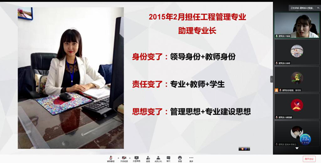 工程管理专业长张好徽在《从事务员到专业长》的故事分享中,谈到2009年6月来校工作至今,从事务员岗位到教师再到担任专业长。她从事务员兼职教师上课,到后来成为正式教师的过程中体悟到,作为老师不经意的一句话,会被学生收藏心中,乃至会影响学生的一生。从自己由教师成长为专业负责人的过程中体悟到,角色转换了,责任也增加了,一定要带好队伍,做好“三总”“三师”,组织好才是真的好。