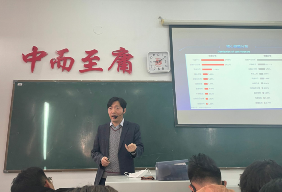 讲座开始,廉主任首先提出三个有关专业计算的有奖问答,激发起大家的热情,随后,向同学们分析了现今的行业、市场,讲述了大数据发展历程,自2015年大数据政策顶层设计到2016年大数据政策落地,乃至2025年国家战略发展规划,让同学们从宏观上对大数据的重要性有了清晰地认识。廉主任又向同学们介绍了大数据人才就业趋势,分析数据科学与大数据技术的专业背景、人才需求增长趋势、核心职能分布、各个城市月薪对比及就业职位。最后讲解了在校学习和实践,介绍课程体系分为理论、技术、实践,鼓励同学们参加学生社团,增强自身能力,把握当下,抓住时机,提升自我。