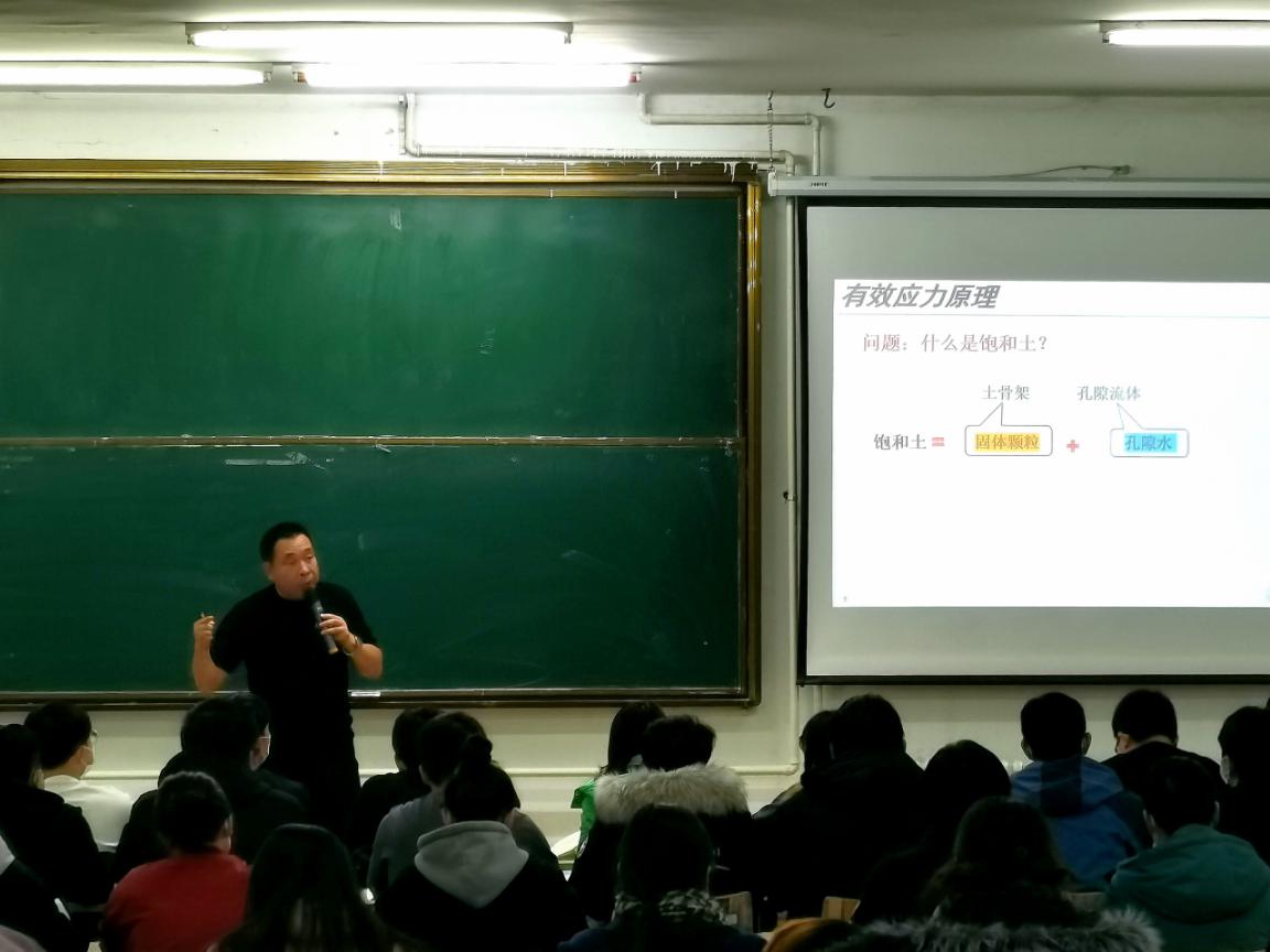 活动开始,首先由土木工程专业教师贺全德进行45分钟的课堂教学演示,讲授课程为《工程地质与土力学》,授课班级为土木193班,此环节主要是通过现场教学,适度体现思政教育资源如何有效融入课堂教学,讲授中,贺老师依据“有效应力原理公式”与学生有效学习时间相联系,告诉学生珍惜时间,在有效的时间内做有意义的事情。随后进行10分钟的现场说课,贺老师针对“有效应力原理”内容,汇报如何深入挖掘和提炼课程中所蕴含的思政要素和德育功能。说课后又安排了现场互动环节,教师主要从课程思政切入点的选取、教师怎样能做好课程思政、能否有较好的课程思政案例库推荐等方面进行提问,贺老师对大家所提出的问题一一解答,现场气氛十分活跃。